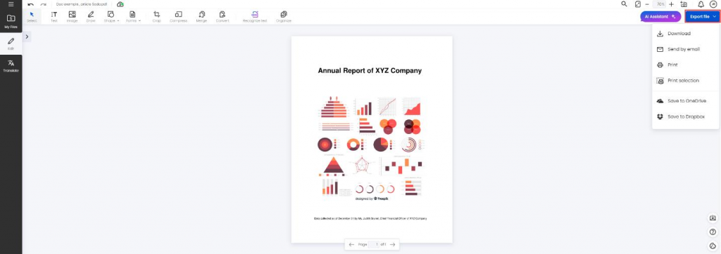 Absolutely! Exporting, downloading, or sharing your document with a colleague is easy. Click on Export file, on the top right, and choose between the different options. You can also save it to OneDrive or Dropbox. Your colleague will receive an email allowing them to download the file without the ability to modify it.
