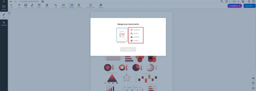 Click Merge in the red box, then select + to choose the location from which to download the file for merging. You have several options, including your device, your files, OneDrive or Dropbox. Follow the