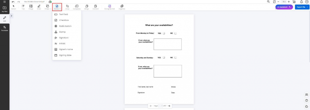 Yes, you can and our tools are free! From a blank document, or another file, you can build your form with the help of the Forms icon. With this tab, you can add text fields, checkboxes and signatures, but don’t hesitate to explore other features, such as Text, Image, Draw or Shape, to unleash your creativity. With so many possibilities, your imagination is sure to fly!