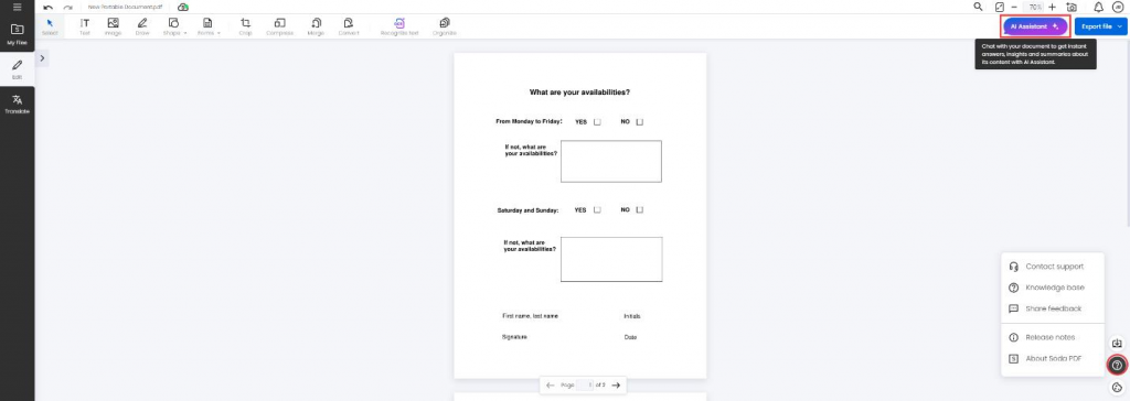 With Soda PDF online, you are never alone. You can talk to the AI Assistant concerning the challenges you are facing with your document. That way, you can obtain instant responses, information on how to convert Word to PDFs and even summarize.