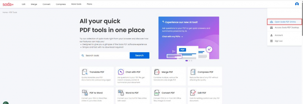 Access the online version of the tool by opening the Soda PDF website > Open Soda PDF online