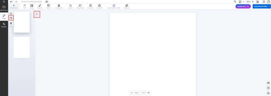 Pour annexer des pages à votre document, cliquez sur > à gauche de votre écran et ensuite sur Dupliquer. Ajoutez autant de pages à votre projet que vous le voulez!
