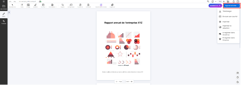 Absolument! Exporter un document, le télécharger ou le partager à un collègue est simple. Cliquez sur Exporter le fichier, en haut à droite, et choisissez la fonction qui vous convient. Vous pouvez également l’enregistrer dans OneDrive ou Dropbox. En recevant un courriel, votre collègue pourra télécharger votre document, mais il ne sera pas modifiable.