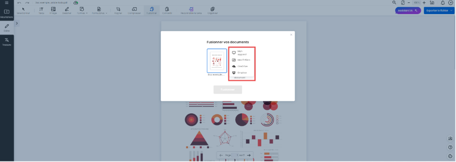 Cliquez sur l’icône Fusionner dans l’encadré rouge, puis sur le + pour choisir à partir de quel emplacement télécharger le document à fusionner. Plusieurs choix s’offrent à vous : à partir de votre appareil, de vos fichiers, de OneDrive ou Dropbox. Suivez ensuite la procédure et fusionnez vos documents. Pour plus de détails sur la fusion de plusieurs documents, consulter Fusionner des PDF.