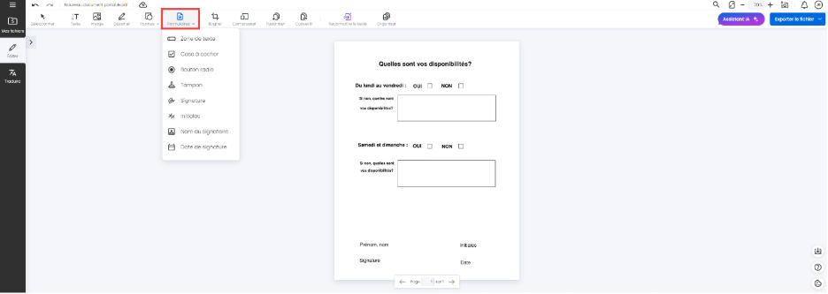 Absolument! À partir d’un document vierge, ou d’un autre fichier, vous pouvez construire votre document à l’aide de l’icône Formulaire. Avec cet onglet, vous pourrez ajouter des zones de texte, des cases à cocher et signature, mais n’hésitez pas à sortir du cadre et utiliser les autres fonctionnalités, comme Texte, Image, Dessiner ou Forme. Impossible de manquer d’imagination avec autant de possibilités!