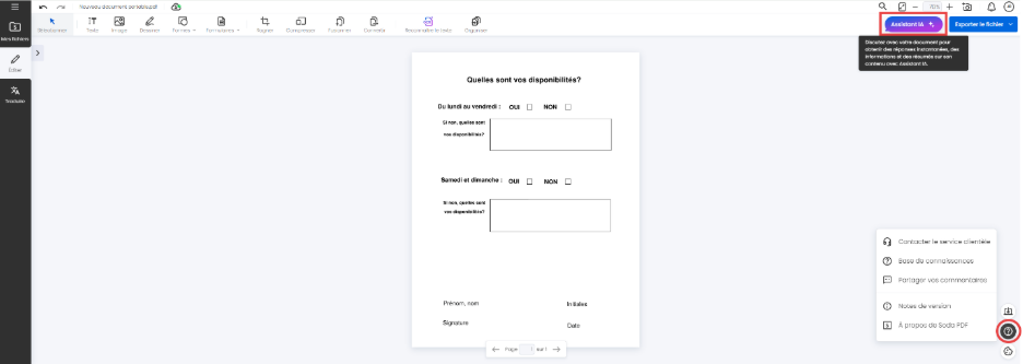 Avec Soda PDF en ligne, vous n’êtes jamais laissé à vous-même. L’Assistant IA peut discuter avec vous concernant votre document. Ainsi, vous obtiendrez des réponses instantanées, des informations et des résumés.