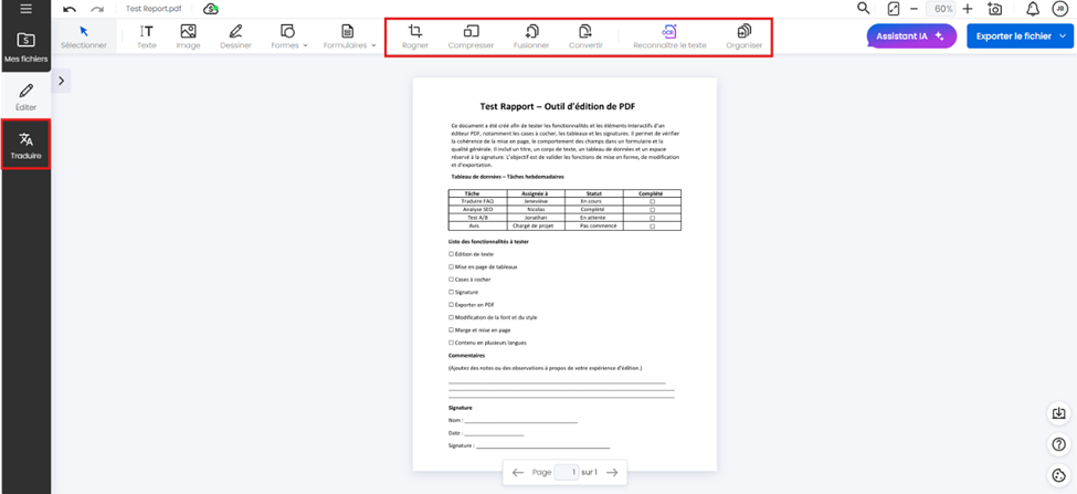 Avec les autres fonctionnalités, vous pouvez compresser de gros PDF, rogner des pages, fusionner plusieurs documents, les convertir dans un autre format ou organiser les pages. Vous pouvez aussi le faire traduire ou poser des questions à l’Assistant IA.